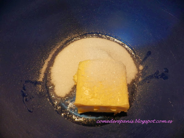 En un bol mezclamos el azúcar con el aceite y la mantequilla, debo de recordar que los ingredientes deben estar a temperatura ambiente y que la mantequilla debemos cortarla en trozos, en la foto la he puesto así , pero antes de batirla la he tenido que partir.