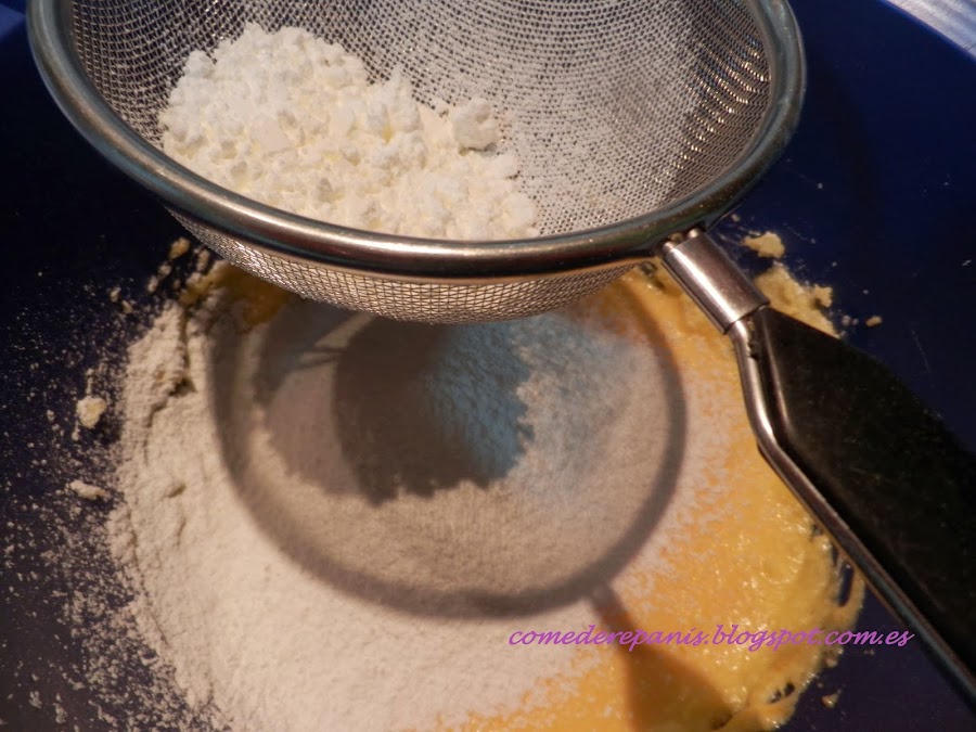 Añadimos la harina de trigo, la de maíz y la levadura química, todo esto tamizado, me gusta tamizar en el momento antes de batir dicen que tamizar es imprescindible para airearla y de ese modo suba y quede más esponjoso. Continuamos batiendo, he de avisar que esta masa no queda ligera como la de un bizcocho, esta masa queda bastante espesa.