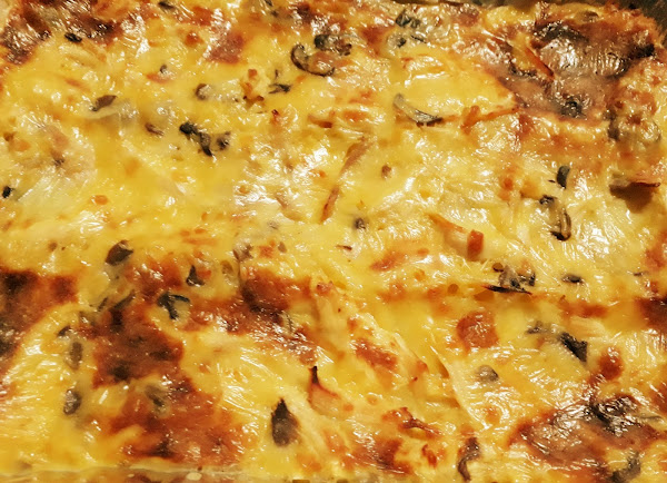 En una sartén grande caliente colocar la mantequilla,cebolla,chile dulce,apio y ajo dejar cristalizar,una vez listo agregar el jamón cocinar 5 minutos,coloque la harina mezclar bien,agregar la leche,crema dulce,caldo de pollo,mostaza,salsa inglesa,sal,pimienta y azúcar dejar hervir y espesar,ya listo colocar los hongos y la pasta de plumas cocinadas dejar hervir,aparte del calor y colocamos en un pirex rectangular mediano rociar el queso gouda y llevar al horno precalentado a 350grados f por 20 minutos o al dorar,una vez listo servir de inmediato.