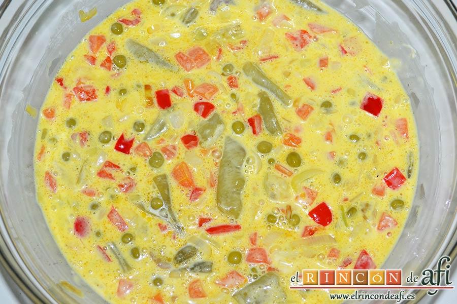 Ahora vertemos la verdura sofrita al bol de los huevos...