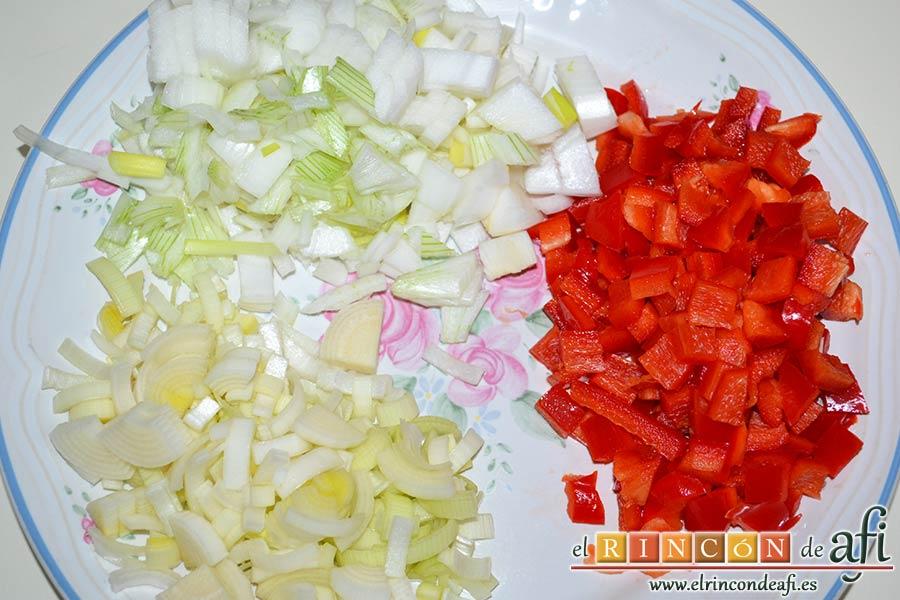 Picamos las cebolletas y el pimiento y las rodajas del puerro.