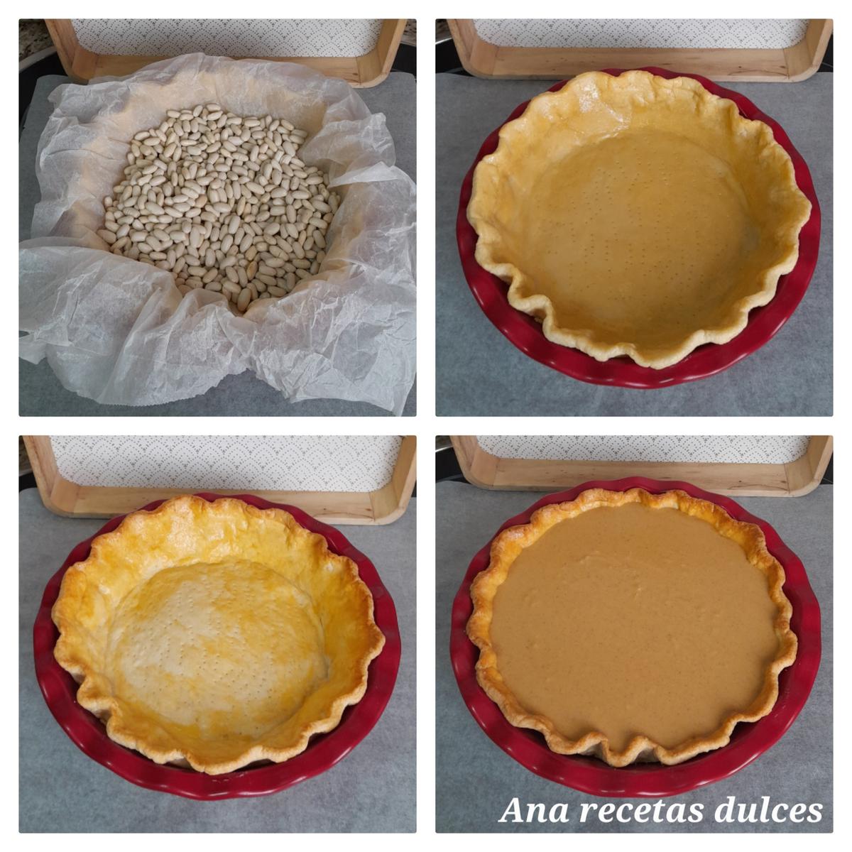 Sacamos del congelador y pinchamos la base con un tenedor, arrugamos un papel de hornear y cubrimos la base, los laterales y los bordes, ponemos encima peso para que la base no se deforme y se mantenga plana, (garbanzos, abichuelas o bolitas de cerámica especial para hornear).