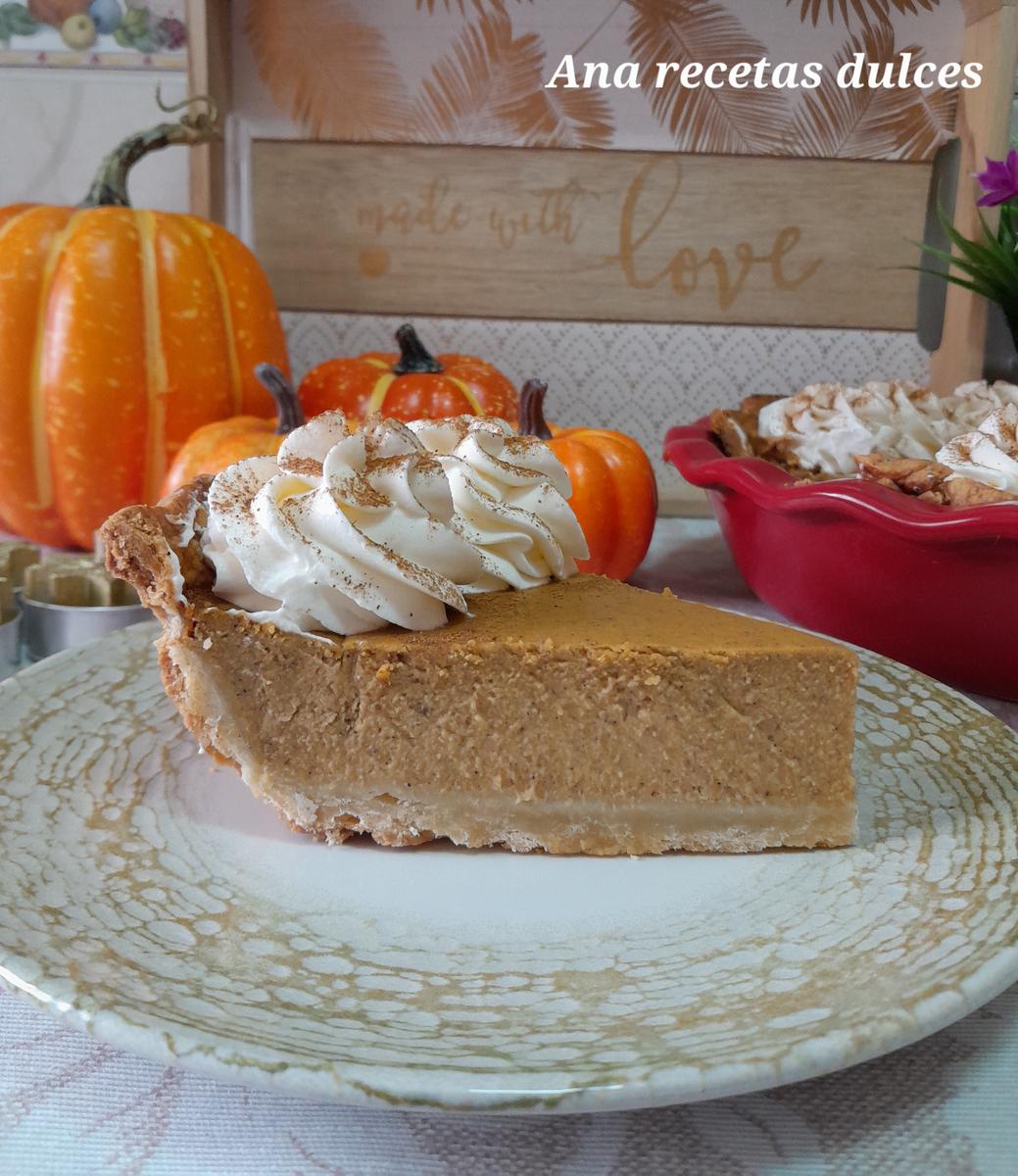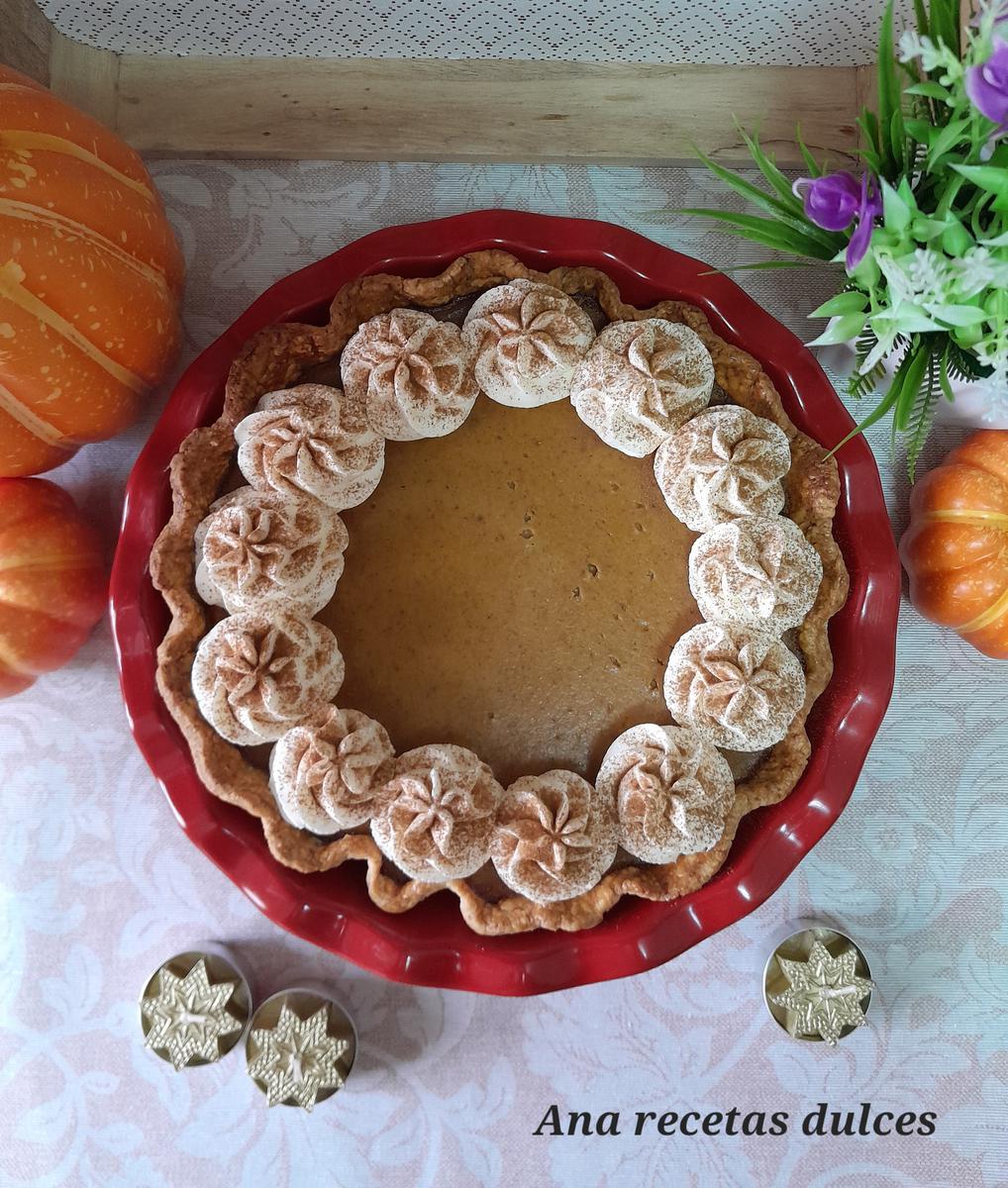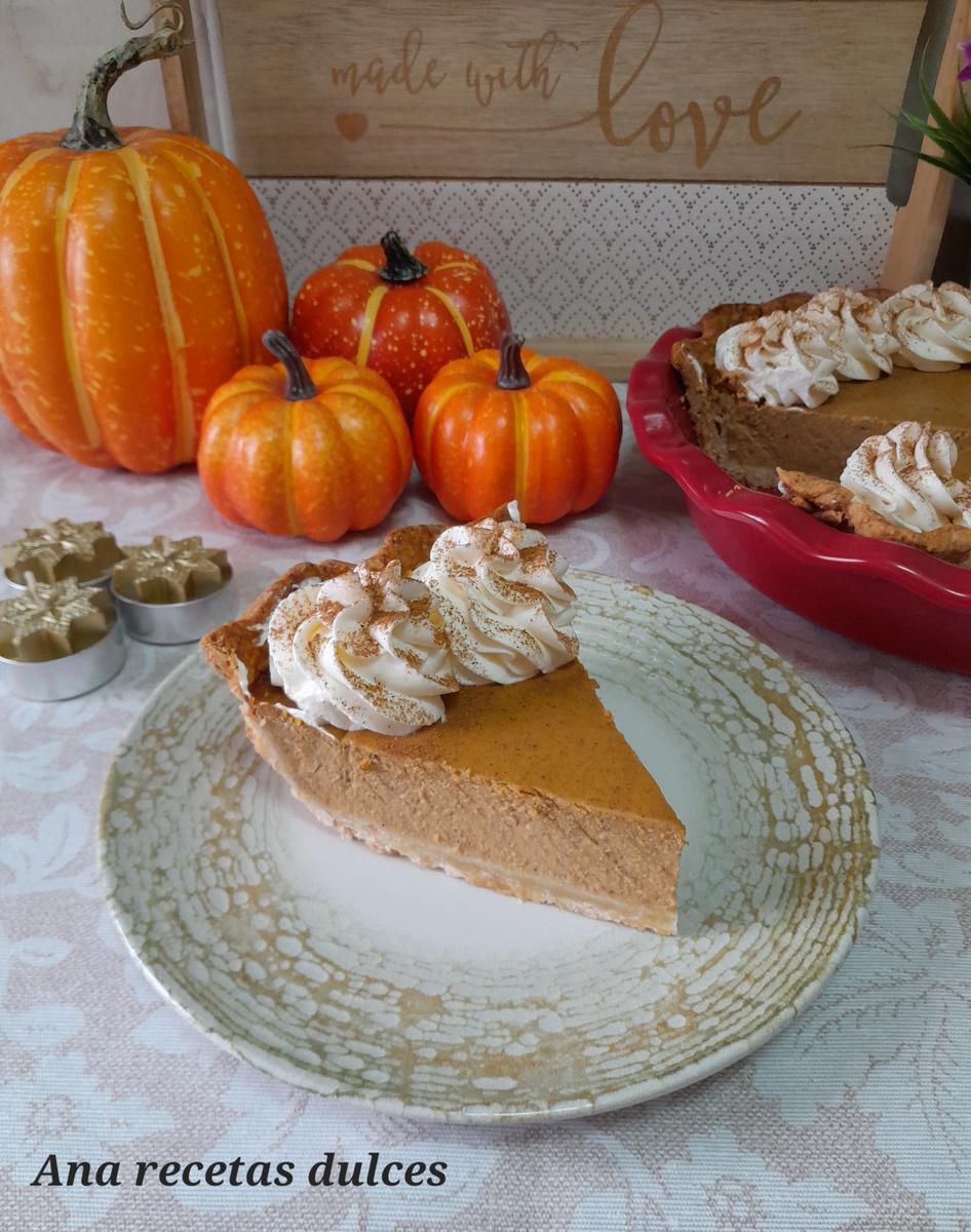 Es una crema a base de huevos, leche, azúcar y por supuesto puré de calabaza, está crema se hornea sobre una base de masa quebrada y generalmente se acompaña o se cubre con nata montada (crema de leche).