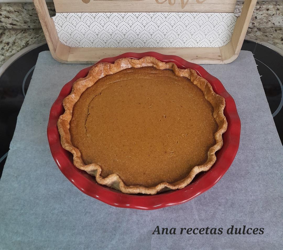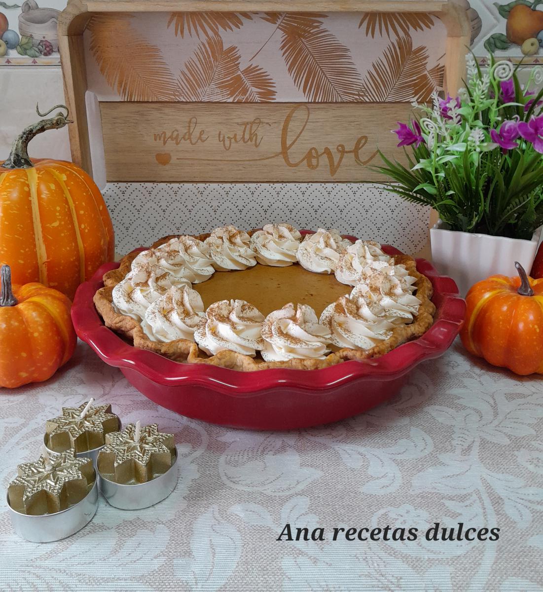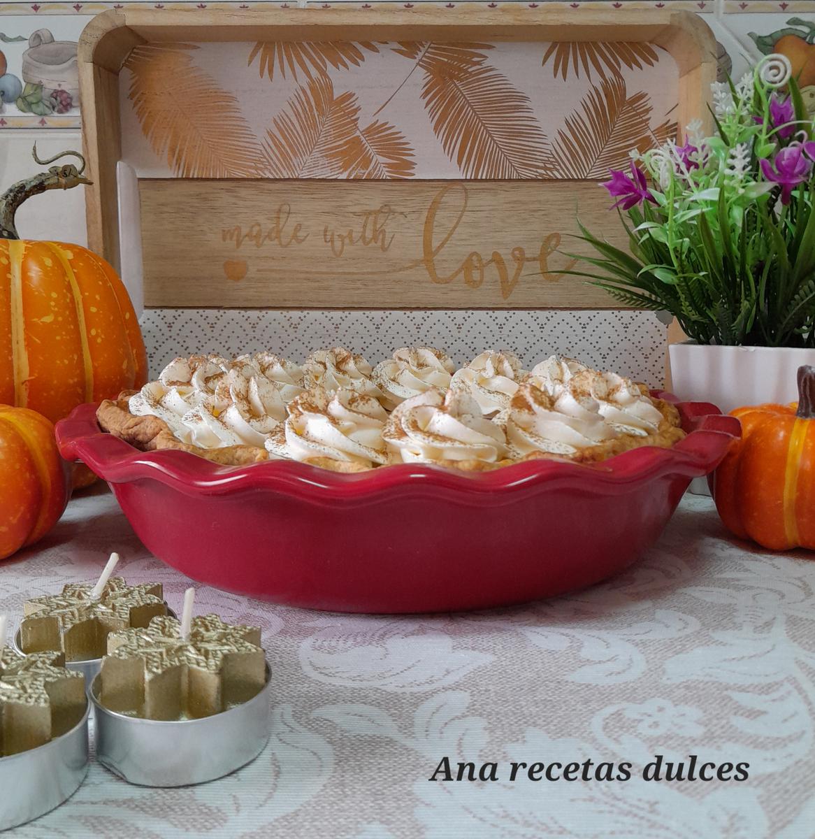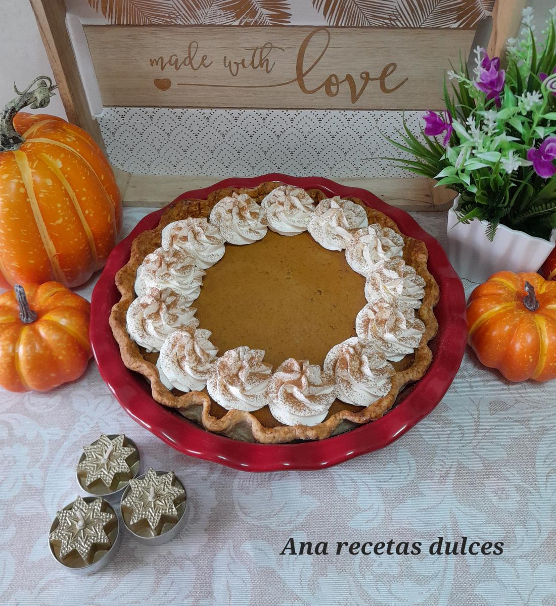 Es una crema a base de huevos, leche, azúcar y por supuesto puré de calabaza, está crema se hornea sobre una base de masa quebrada y generalmente se acompaña o se cubre con nata montada (crema de leche).
