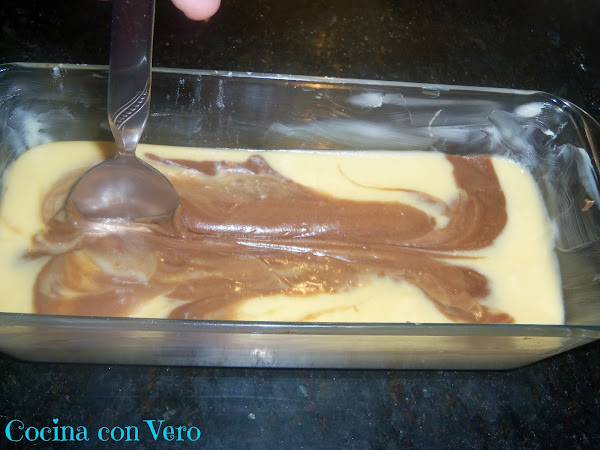 7/ Untamos de manteca por todos los lados el recipiente de cristal de plunk cake y le echamos un poco de harina en él para que no pegue, echándole la masa blanca al fondo y seguidamente la masa de chocolate que se hizo.