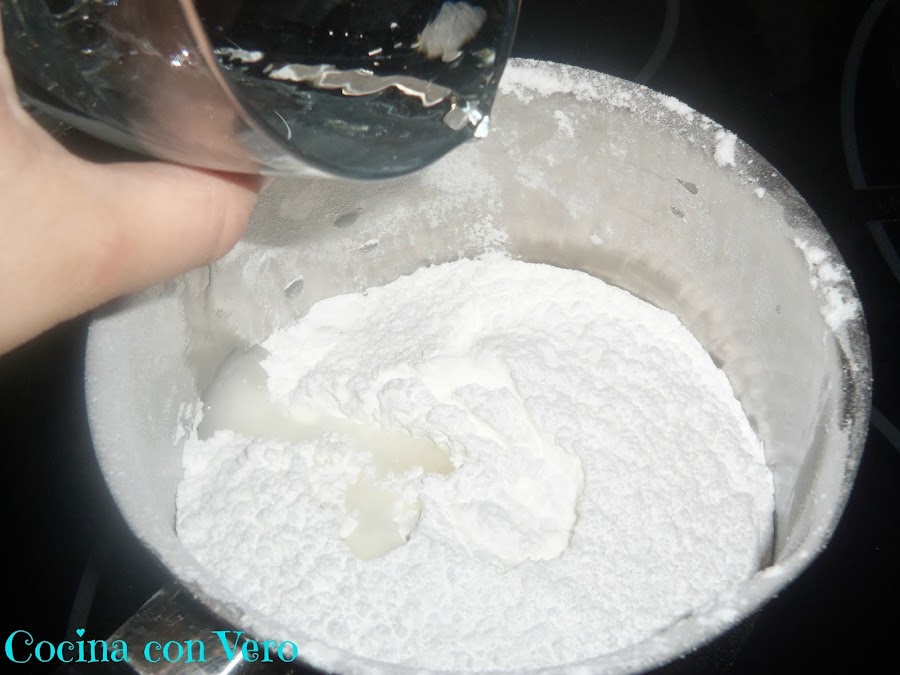 1/ En un cazo sin ponerlo al fuego echamos el azúcar glasé e incorporamos muy poco a poco el agua.