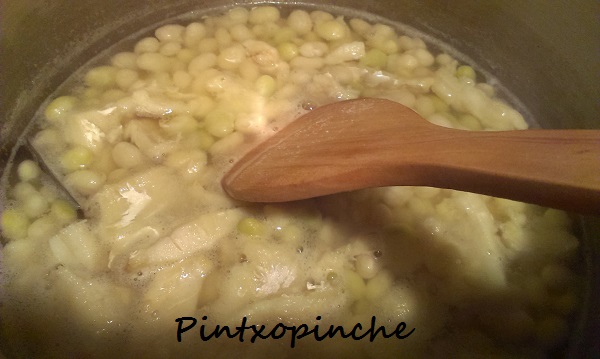 4. Cocemos las pochas en el caldo de verduras hasta que estén tiernas, esto variará según la calidad de las pochas y también de si la hacemos en la olla normal o en la esprés. Pero aproximadamente en 20 minutos estarán cocinadas. Las cocemos con una hoja de laurel.