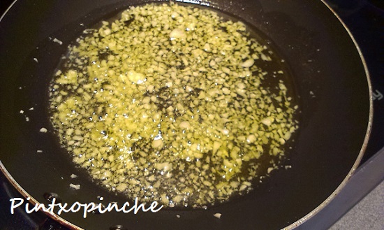 6. Picamos unos ajitos muy pequeños, aproximadamente 4 o 5 dientes de ajo. Freímos en un poco de aceite de oliva. Bajamos el fuego y ponemos una cucharadita colmada de pimentón, damos una vuelta con cuidado de que no se queme el pimentón, solo que se disuelva. Añadimos el perejil muy picadito.