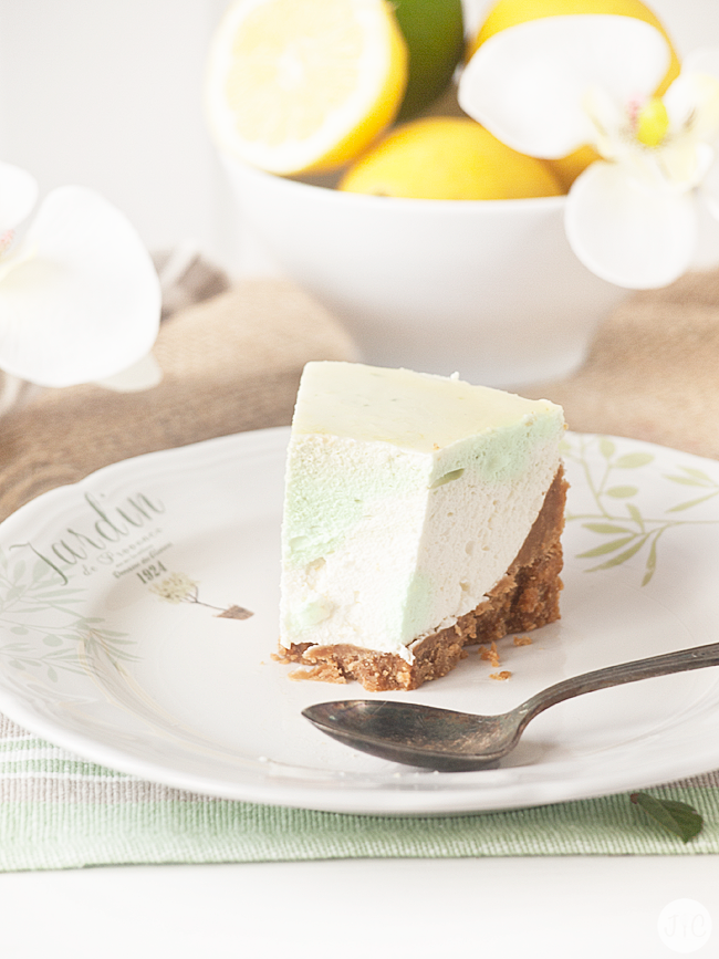Me encantó el hecho de cortar la tarta y se viese un pequeño efecto maromeado al combinarse los dos colores, el blanco roto con el verde claro, cada uno de un sabor diferente. Como veis, además, la textura de la tarta es perfecta: esponjosa, como una mousse, casi. De las que te metes en la boca y prácticamente se deshace. ¡Una pasada!