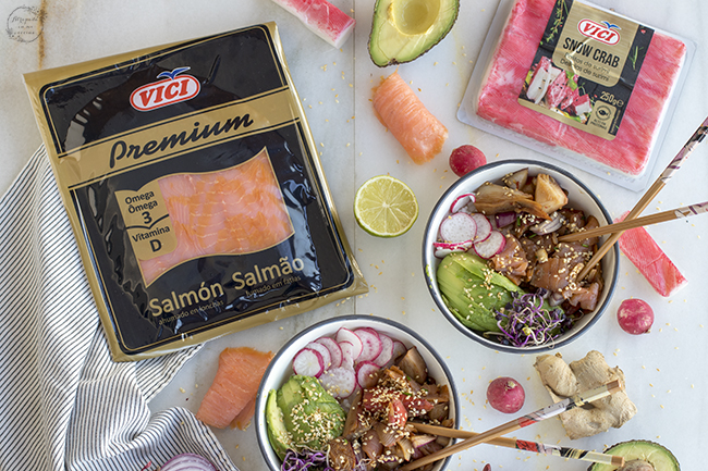 El poke bowl es una de las tendencia gastronómicas en auge, se trata de un plato de origen hawaiano, consistente en una ensalada de arroz con pescado crudo y vegetales. Yo he hecho un poco de "trampa" en esta ocasión y he sustituido el pescado crudo por salmón ahumado y palitos de mar (Snow Crab) de VIČI, sabiendo que hay mucha gente que no se atreve con el pescado crudo. El resultado ha sido fantástico, y se convierte en una opción muy sana después de las fiestas navideñas. Sin duda es una de esas recetas que son tan versátiles que ofrece tanta variedad como ingredientes le pongamos.