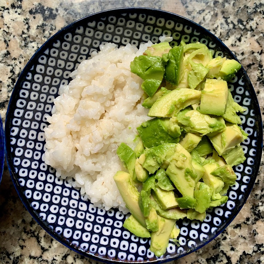 Mientras se enfría un pelín el arroz, cortamos el aguacate a dados.
