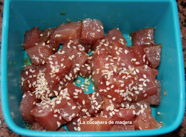 Cortamos en dados pequeño el atún que hemos congelado 2 días y descongelado la noche anterior. En un vaso pones tres cucharas de soja y media cucharita de postre de aceite de sésamo; se lo añadimos al atún y dejamos macerar mientras montamos el poke,( yo le añadí semillas de sésamo)