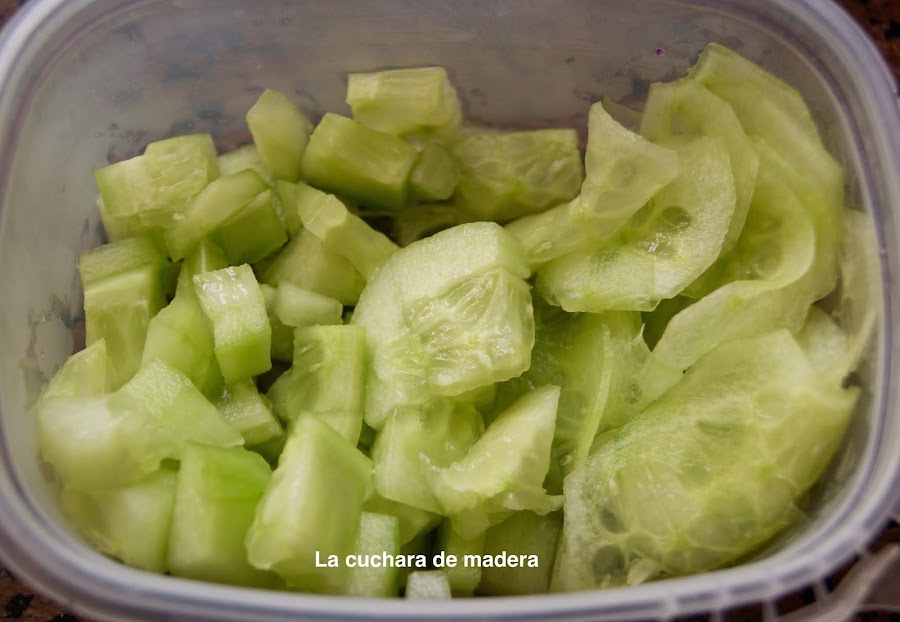 El pepino lo he pelado, unos lo corte en dados ( para el poke de atún) y en láminas para el poke de langostinos