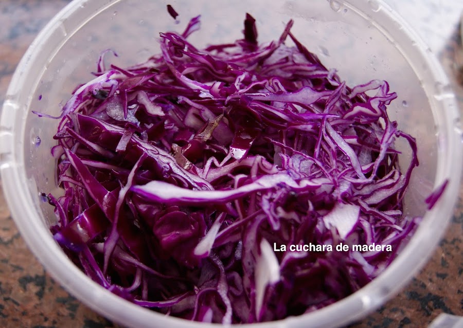 Cortamos muy fino la col roja y la ponemos en agua para que hidrate un poco y quede más crujiente, reservamos; yo la suelo poner unas horas antes y lo dejo en la nevera