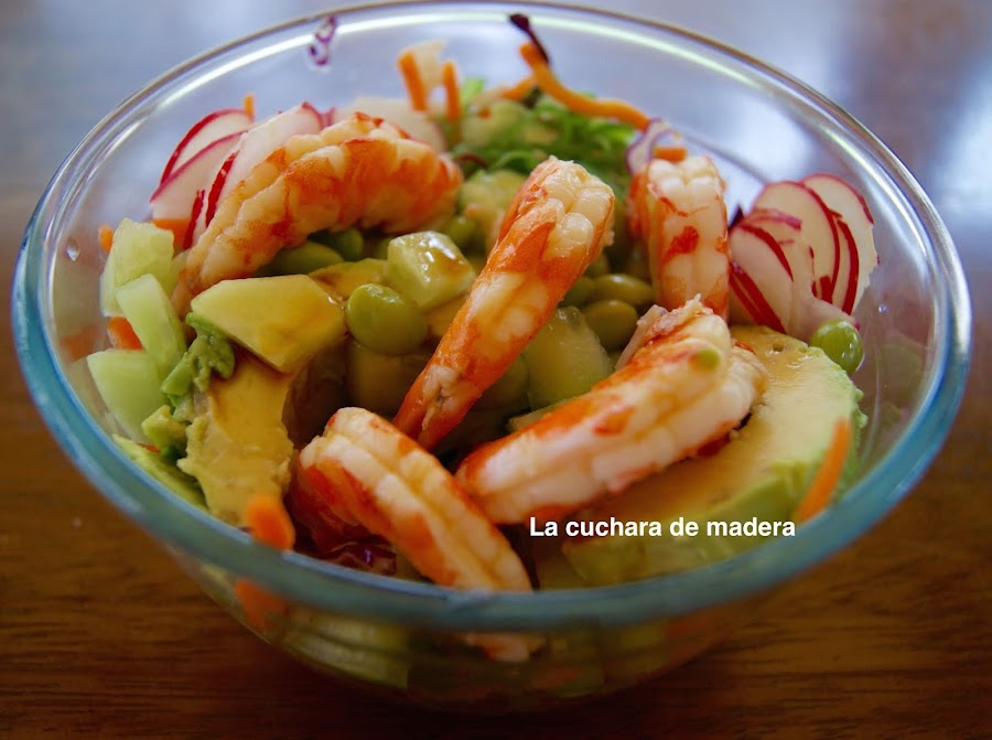 Los ingredientes no los pese pero en las fotos verás las cantidades que hemos utilizado y el recipiente es un bol , no ensaladera, se toma individualmente. Puedes sustituir ingredientes que te gusten más.