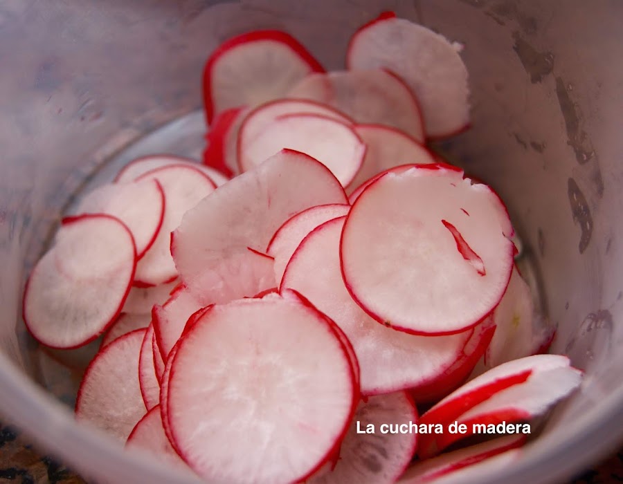 Lavamos y cortamos muy finos rábanos, yo no los pelo, lo dejas en agua mientras sigues con los demás ingredientes