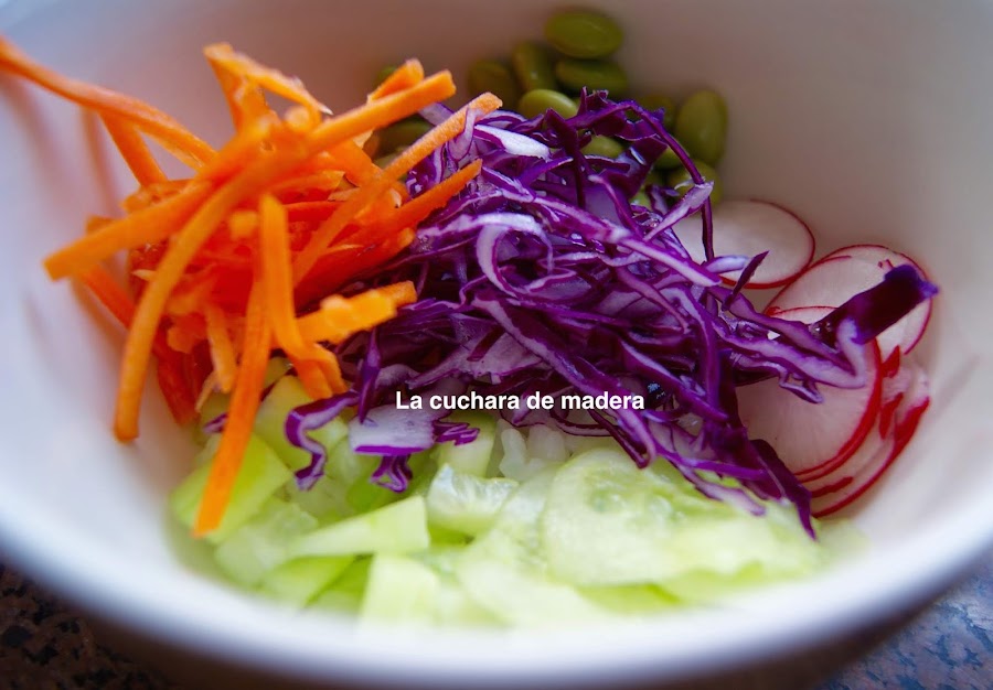 Encima en los laterales ponemos la zanahoria, los rábanos, los edamame y el pepino, en el centro la col roja