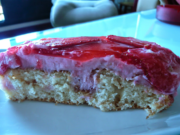 Entonces, tomamos el bizcocho y, con la parte de atrás de una cuchara de madera, hacemos diversos agujeros en él. Seguidamente, vertimos la crema de fresas aún caliente sobre el bizcocho, intentando que entre bien en los agujeros.