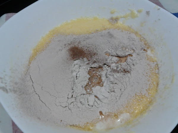 A continuación ponemos los ingredientes secos, repartidos en 3 veces e intercalándolos con los líquidos.