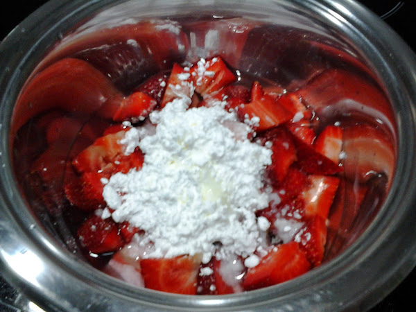 Mientras tanto, preparamos el coulis de fresa. Ponemos en un cazo las fresas cortadas con el agua, el azúcar glas y el zumo de limón. Lo llevamos al fuego hasta que las fresas estén prácticamente desechas. Colamos y reservamos.