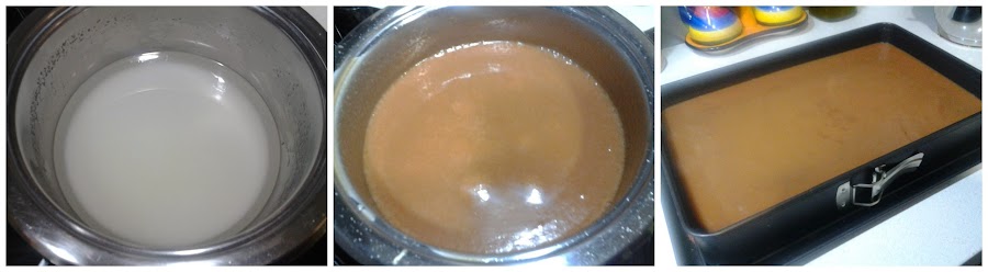 Ahora vamos con el toffee. Ponemos el azúcar en un cazo junto al agua, movemos que se integre bien y dejamos que se haga el caramelo. Cuando el azúcar tenga el color dorado, apartamos del fuego y vertemos poco a poco y con mucho cuidado la nata (crema de leche). Removemos bien y volvemos a poner al fuego entre 5 y 10 minutos mas. Dejamos templar un poco y vertemos por encima de nuestro bizcocho. Dejamos enfriar por completo el toffee para que se asiente bien.