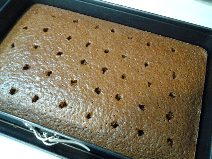 Cuando esté listo, sacamos y dejamos templar. Cuando esté tibio, cogemos el mango de una cuchara de madera, hacemos agujeros por todo el bizcocho y dejamos que enfríe por completo.