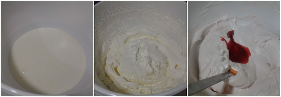 En un bol ponemos la nata (crema de leche), que debe estar super fría con el azúcar y montamos. Cuando el coulis haya enfriado lo mezclamos con la nata (crema de leche) con movimientos envolventes para que no se baje demasiado.