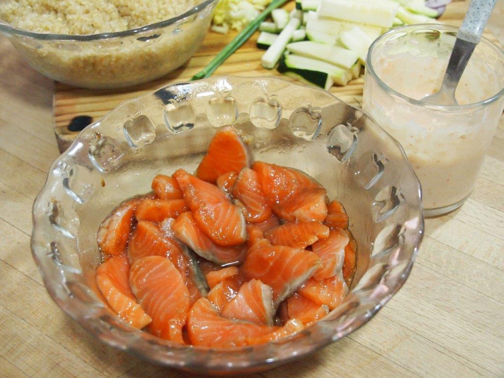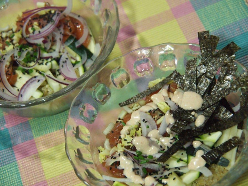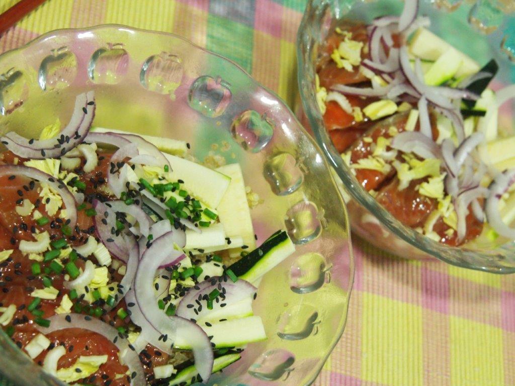 Preparamos cada cuenco poniendo en el fondo una cama de quinoa con una pizca de sal, y sobre la quinoa vamos colocando en un lado el salmón y en el otro los bastones de calabacín. Sobre todo ello añadimos la cebolla y sobre la cebolla espolvoreamos cebollino picado. Ponemos en un lado unas tiras de alga nori y unas semillas de sésamo negro.