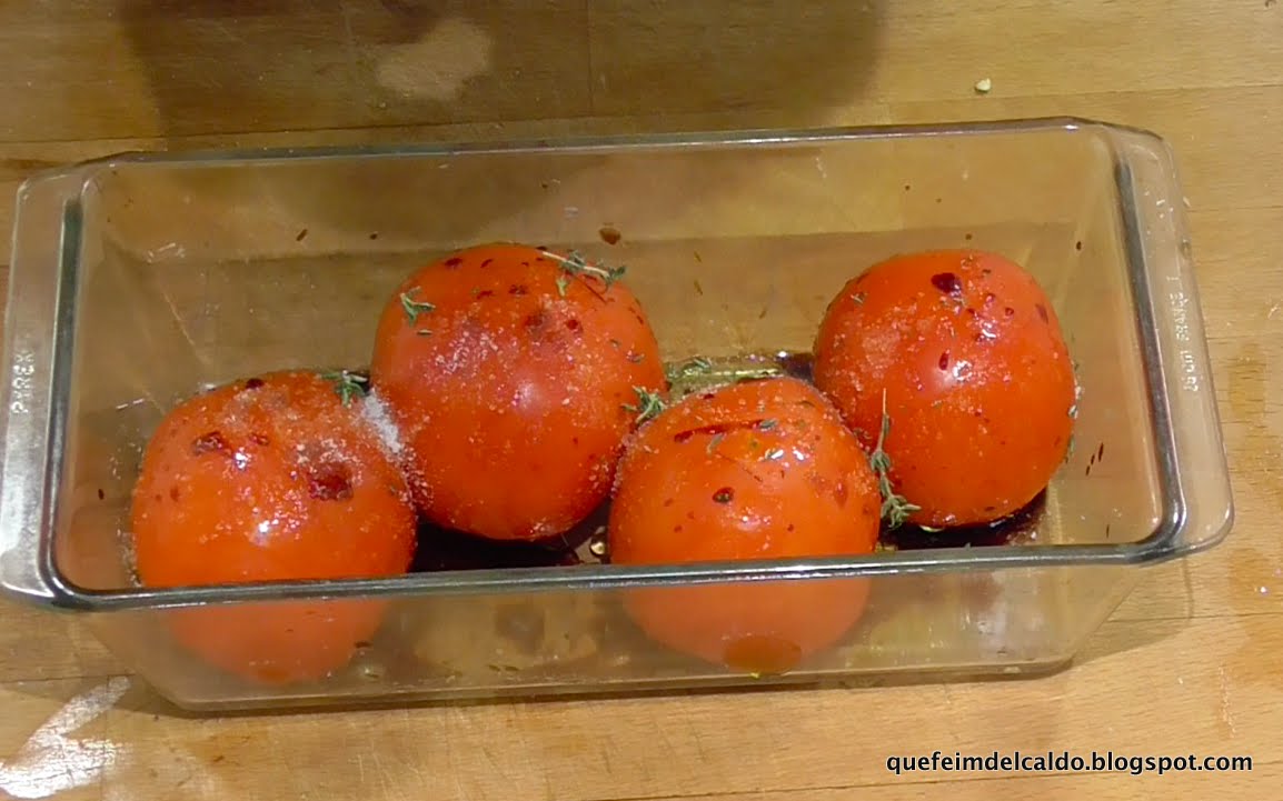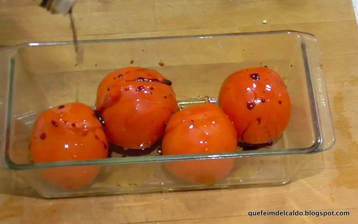 Mientras tanto vamos a asar los tomates, los tomates tienen que estar bastante maduros, los ponemos en una fuente de horno, los pinchamos.