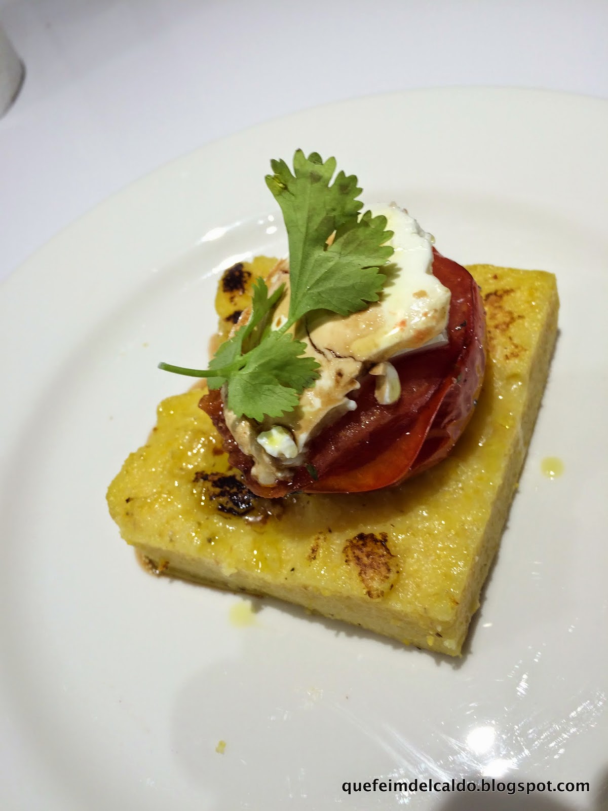 Primero ponemos la polenta, sobre ella el tomate asado cortado por la mitad, encima el queso de filadelfia, ponemos aceite de oliva, vinagre de módena y acabamos con unas hojas de cilantro.