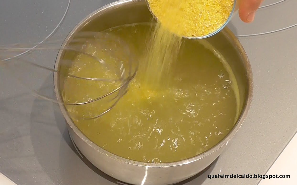 Cuando empieza a hervir el caldo añadimos en forma de lluvia la polenta, sin parar de mover el caldo con una varilla de mano, así conseguimos que no se formen grumos.