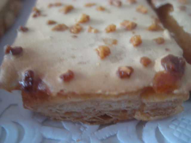 Preparación: Batir el azúcar glas con la clara de huevo y ver cómo nos queda de consistencia. Si queda muy líquida añadir algo más de azúcar y si queda demasiado espesa agregar un poco más de clara de huevo. Poner la lámina de hojaldre sobre una bandeja de horno forrada con papel y extender sobre el hojaldre una capita uniforme de glasa. Salpicar con granillo de almendra y luego con un cuchillo o cortapizzas hacer porciones rectangulares, procurando que sean todas del mismo tamaño. También se pueden partir antes y luego poner la glasa, de la otra forma es más rápido, pero cada uno que lo haga como mejor le quede. Una vez preparadas las polkas cocer en el horno a 200 º C o algo menos, según los hornos durante 20 minutos o hasta que estén subidas y con la capa de glasa dorada. Colocar en rejilla y dejar enfriar antes de consumir.