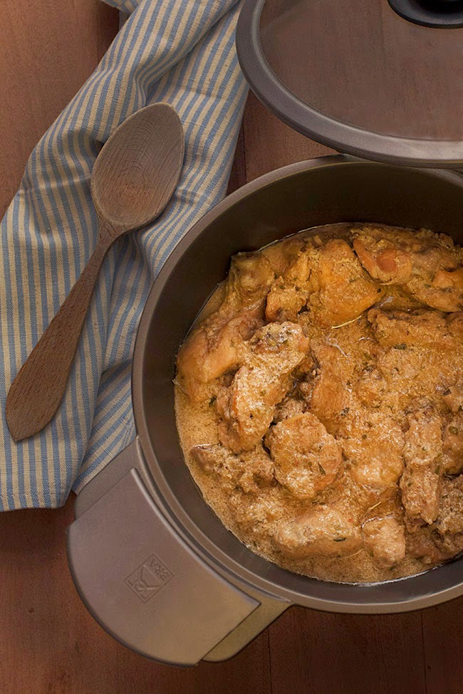 Batem els rovells d"ou amb la nata (crema de leche), les afegim a la cassola, rectifiquem de sal i ho deixem coure uns deu minuts més, fins que el pollastre quedi ben tendre i es formi una salsita espessa.