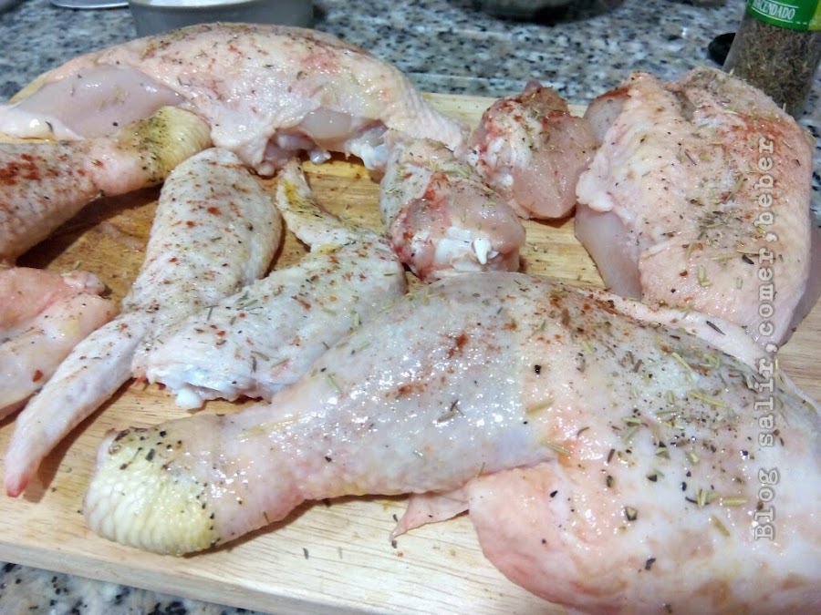 Hemos tenido las pechugas y las alitas 125 minutos, los muslos y contramuslos 140 min. Cuando lo saquemos del horno, lo pasamos directamente a un recipiente con agua y hielo para abatir rápidamente la temperatura. Una vez enfriado seleccionamos las partes que vamos a cocinar y congelamos el resto para otra ocasión. Solo quedará darle un golpe de sartén para dorarlo, peso eso lo haremos justo antes de servir.
