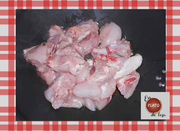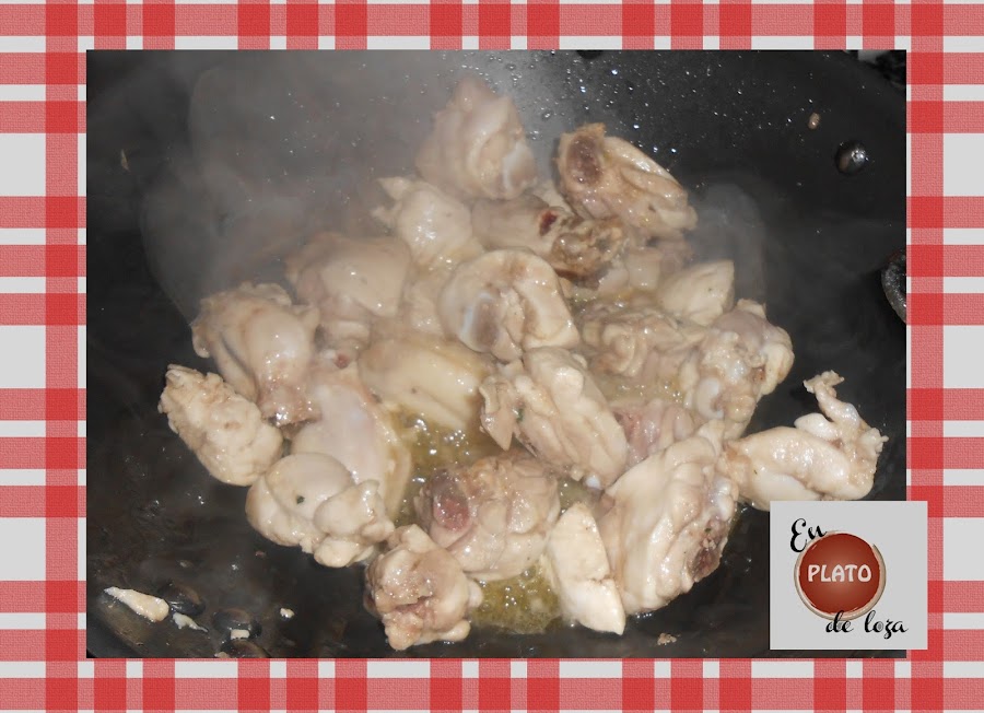 Comenzamos la elaboración en sí del plato echando en una sartén un buen chorro de aceite de oliva virgen extra (AOVE) y sofreímos el pollo que hemos salado previamente.
