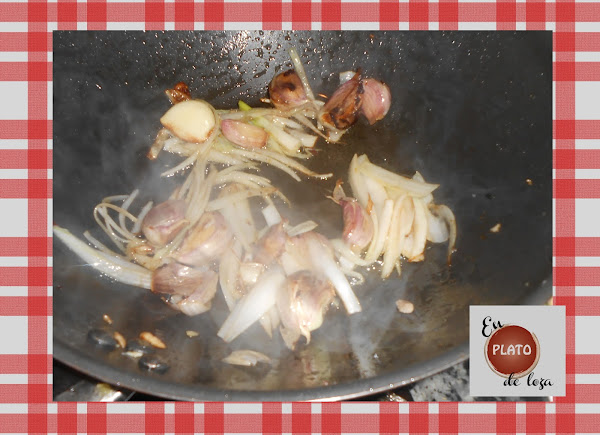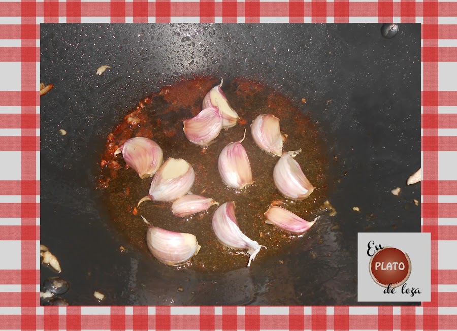 En fin, cuando ya este dorado lo sacamos y ponemos en el aceite a freír una cabeza de ajos enteros previamente machacados.