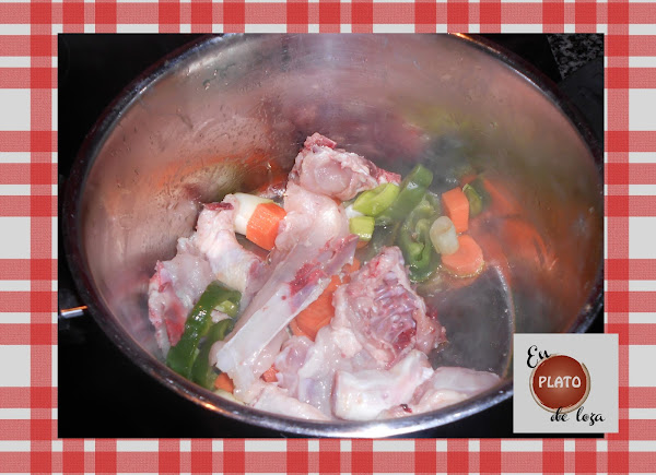 Para el caldo de pollo yo hice un fondillo con la carcasa y algunas piezas del pollo que compré. Siempre da mejor sabor, pero una pastilla de caldo o un vaso de los precocinados de tetra brick es más rápido y nos vale. El fondo yo lo preparé como digo sofriendo las carcasas y estas piezas menores con un puerro, un pimiento y una zanahoria, luego añadí agua y sal y deje cocer una horita a fuego lento. En los últimos 20 minutos añadí una patata desgajada para dar textura y aclarar un poco el caldo. Luego es recomendable desgrasar.