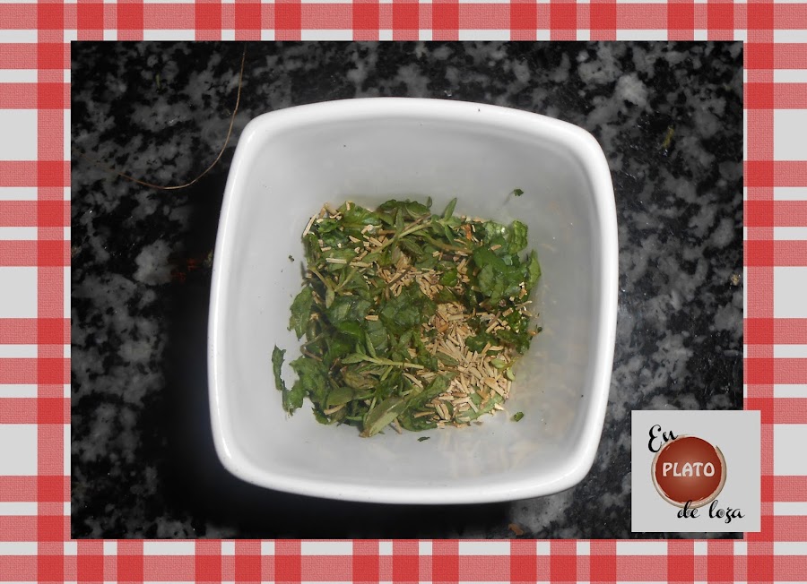 Mientras se sofríe, preparamos la mezcla de hierbas. Yo cogí del "huertito personal de mi patio" un poco de tomillo y unas hojas de hierbabuena. Además, le añadí una media cucharada de romero. El romero es esa especie que si la usamos va a prevalecer siempre sobre las demás por eso siempre tengo respeto de usarla, pero en este plato va bien.