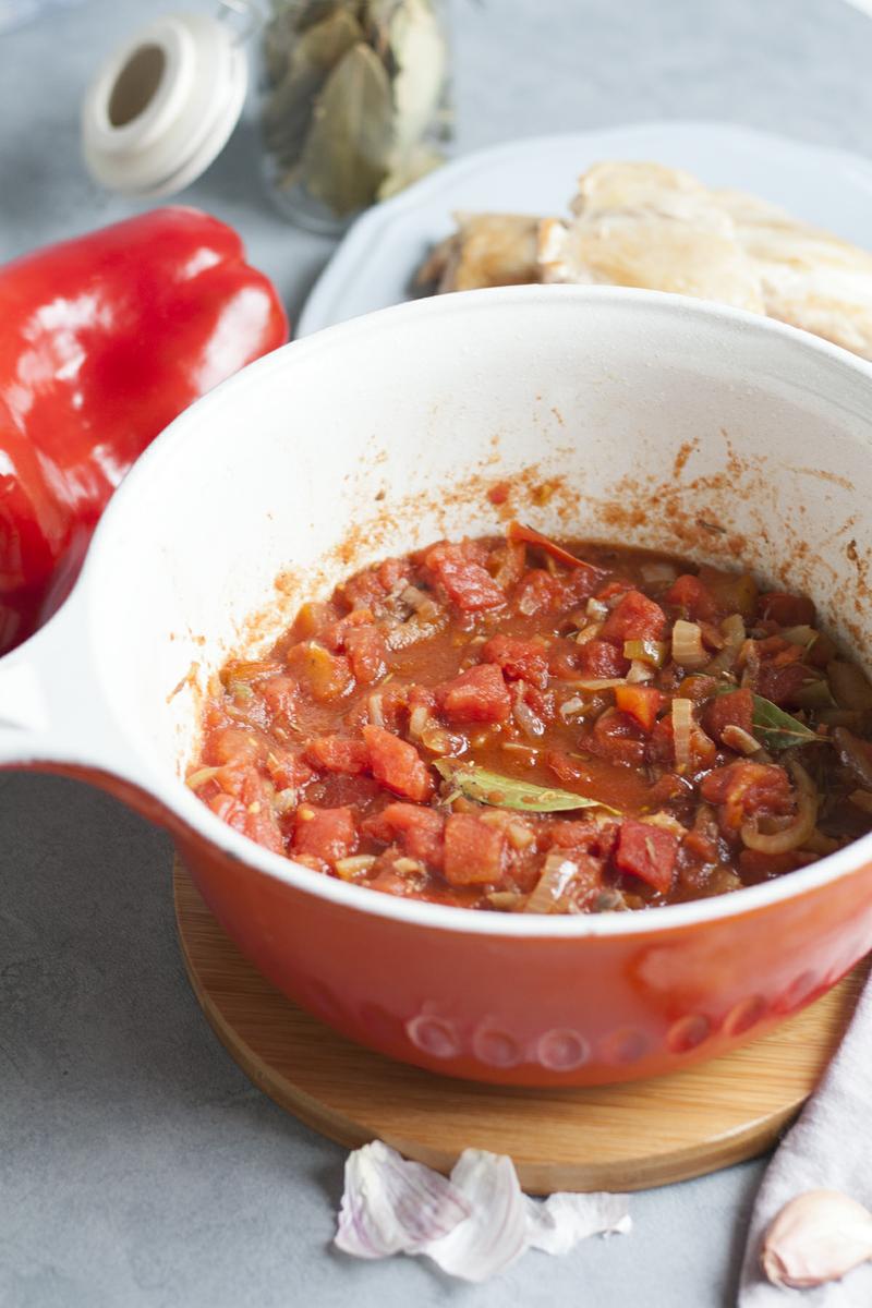 En la misma cacerola donde hemos dorado el pollo añadimos la cebolla y doramos 6-8 minutos hasta que empiece a pocharse, ahora incorporamos las anchoas y los ajos. Removemos bien para que cojan algo de color tan sólo durante 3 minutos. Añade ahora los tomates, salpimenta y con ayuda de tu cuchara o paleta de cocina trocea un poco el tomate. Incorpora el laurel y un poquito de romero. Deja todo durante 5 minutos a fuego medio. En la fotito de arriba que ilustra este paso se nos han colado algunas tiras de pimiento rojo