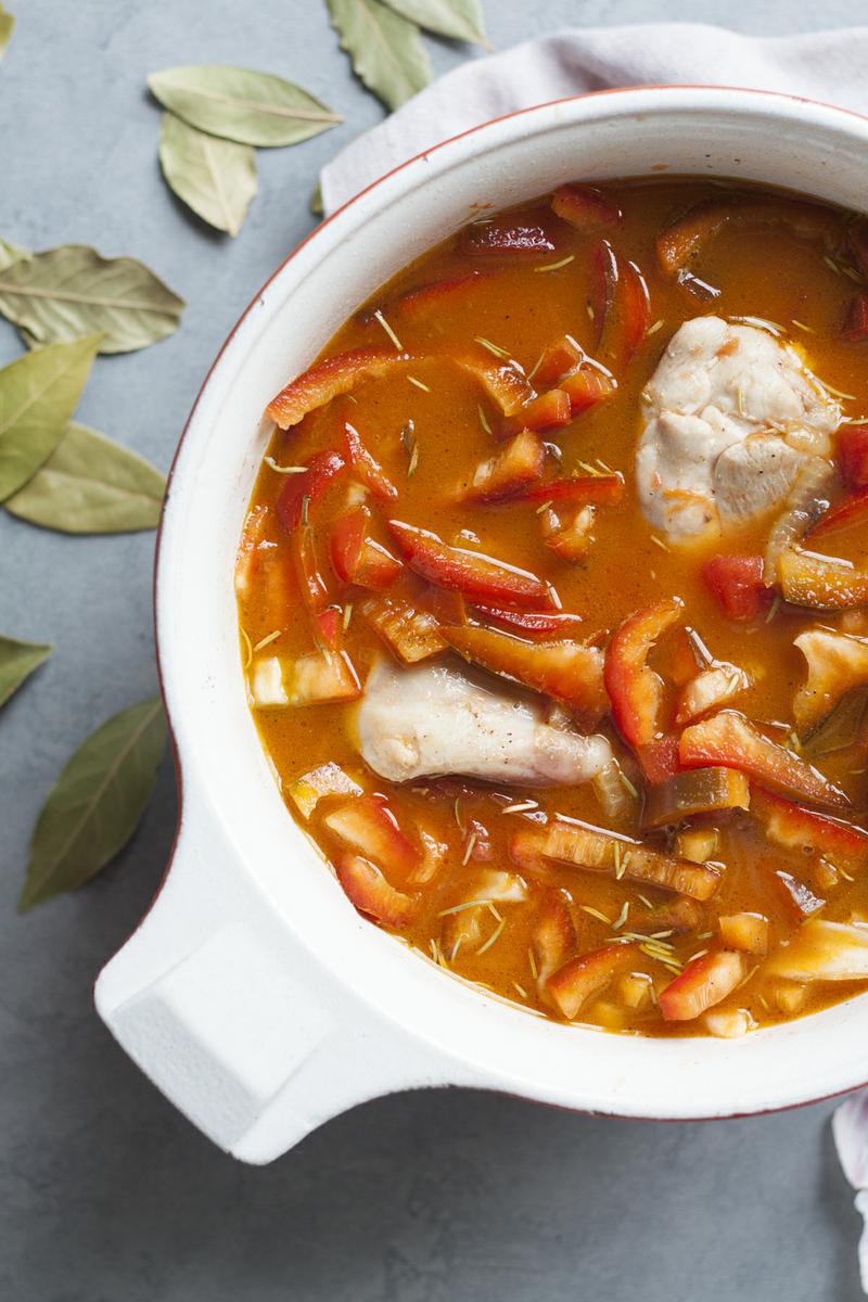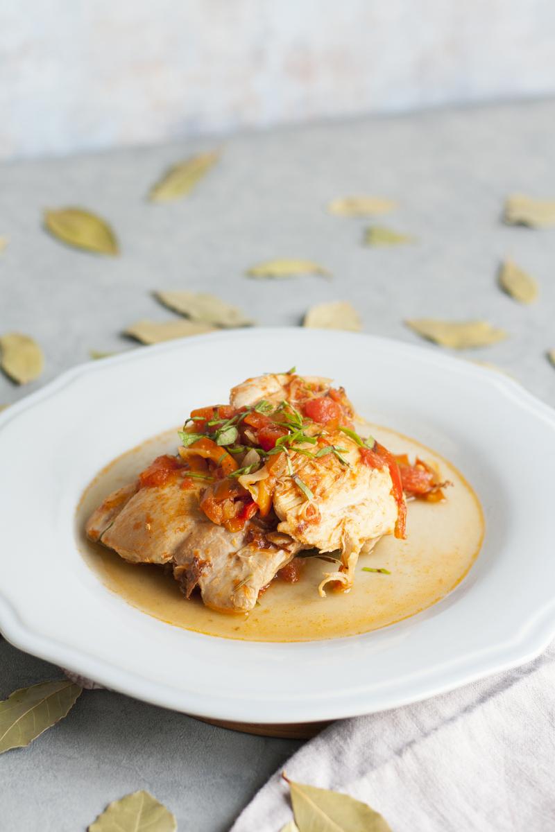 Pasado este tiempo volvemos a meter el pollo de nuevo junto con el caldo, el vino y el pimiento rojo troceado en tiras finitas. Dejaremos que se cocine tapado a fuego medio durante 40 minutos o hasta que el pollo esté tierno, los últimos 10 minutos destapa y sube el fuego para que se evapore un poco el caldo. Una vez apartado, añade una cucharada de alcaparras… prueba de sal y a comer!