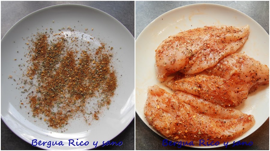 1. Frotamos las pechugas de pollo con la mezcla de sazonador cajún, orégano seco, sal y pimienta. Lo más fácil es espolvorear sobre un plato, colocar encima las pechugas y espolvorear por la cara de arriba, así tienen especias por los dos lados y no nos pringamos demasiado.
