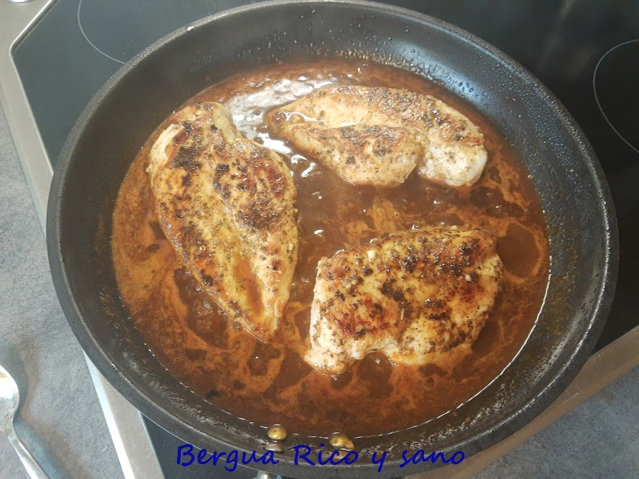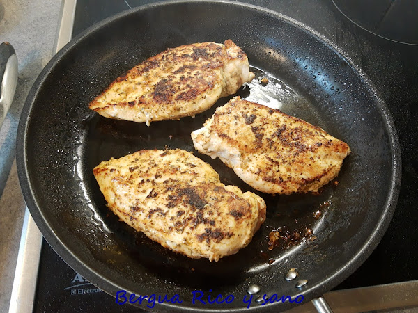2. Sellamos en una sartén donde habremos calentado el aceite a fuego medio-alto y le damos 6-8 minutos por cada lado, hasta que queden doraditas. Sacamos el pollo de la sartén y reservamos.