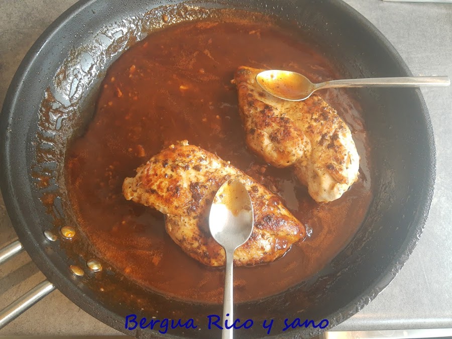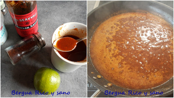 He mantenido la receta excepto por los cambios en las cantidades y un par de ingredientes; me parecía mucha salsa barbacoa y además no tenía tanta en casa, así que reduje la cantidad y suplementé con pasta tomate concentrado, que también espesa, potencia el sabor y no empalaga tanto como la barbacoa. Además usé sirope de arce para compensar la acidez de la lima, que me gusta, pero me pareció demasiado.