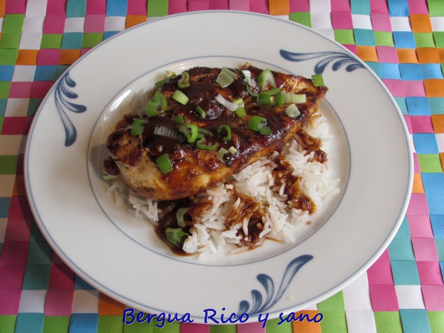 * Servimos las pechugas sobre o junto arroz blanco, rociamos con la salsita y espolvoreamos con rodajitas de cebolleta.