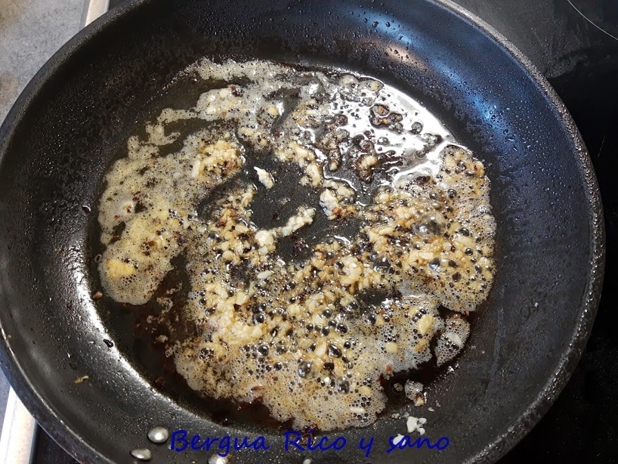 3. En la misma sartén, calentamos la mantequilla hasta que se funda, incorporamos el ajo prensado o muy picadito y cocinamos para que se desprenda el aroma, unos 30 segundos.