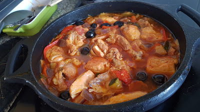 8. Por último, verter el caldo de pollo y las aceitunas negras.