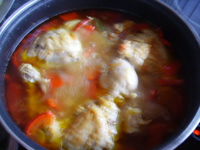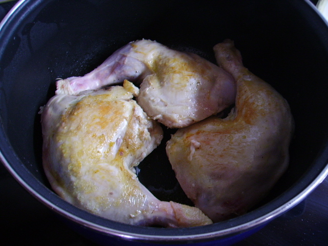 1.- Dorar el pollo salpimentado en un poco de aceite y reservar en una olla. + 3.000€