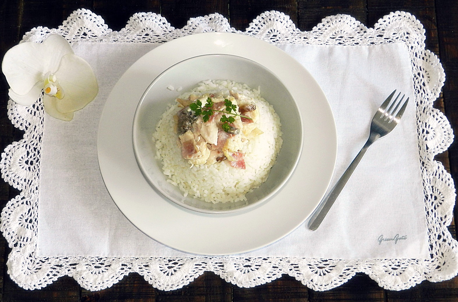 Picamos la cebolla y en el mismo aceite la sofreímos. Cuando la cebolla esté pochadita añadimos los champiñones laminados escurridos y las tiras de bacon cortadas a trocitos. Doramos. Añadimos la nata (crema de leche), removemos bien y dejamos que se cocine todo junto 3-4 minutitos.