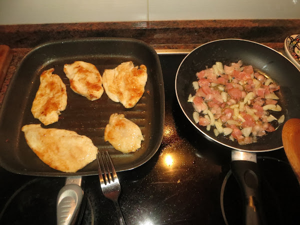 Lo primero que hacemos es salpimentar los filetes de pechuga de pollo y los ponemos a dorar con un poco de aceite en una plancha o sartén. Mientras se nos cocinan, cortamos la cebolla y la ponemos con un poco de aceite en otra sartén, cuando veamos que empieza a estar dorada, añadimos el bacon, que también estará cortado en trozos y cuando empiece a estar dorado le añadimos la nata (crema de leche).