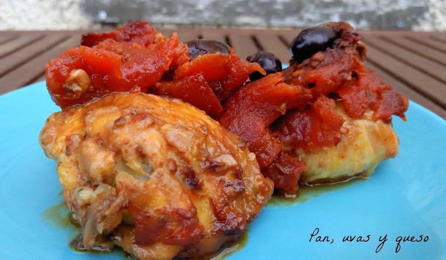 Una vez que tenemos todo el pollo frito, doramos en la misma sartén los otros dos dientes de ajo cortados en rodajas. Añadimos las anchoas, las aceitunas, el tomate (que iremos troceando a medida que se va cocinando), el pollo y la salsaen la que se marinó. Dejamos que de un hervor y lo pasamos todo a una fuente apta para el horno.